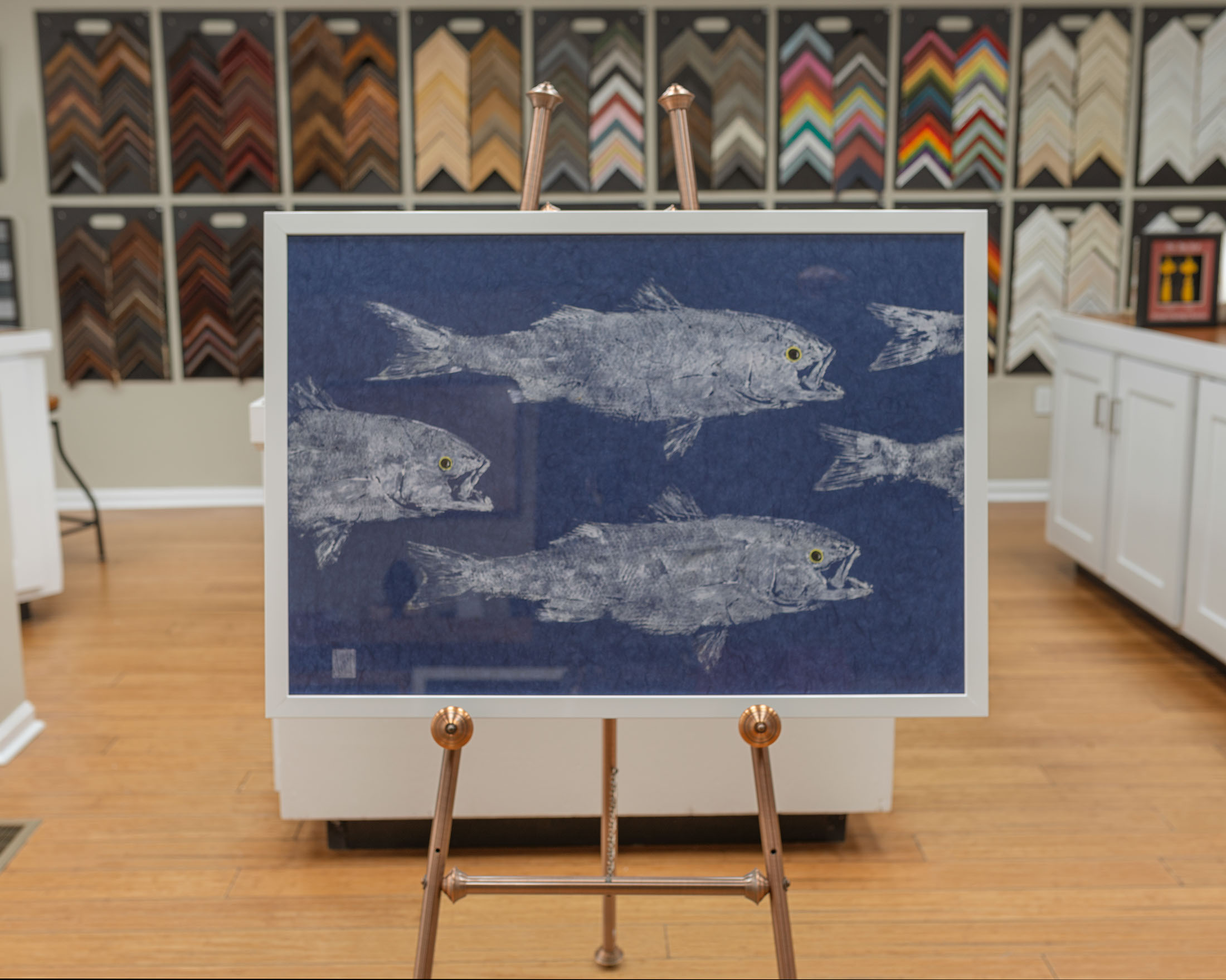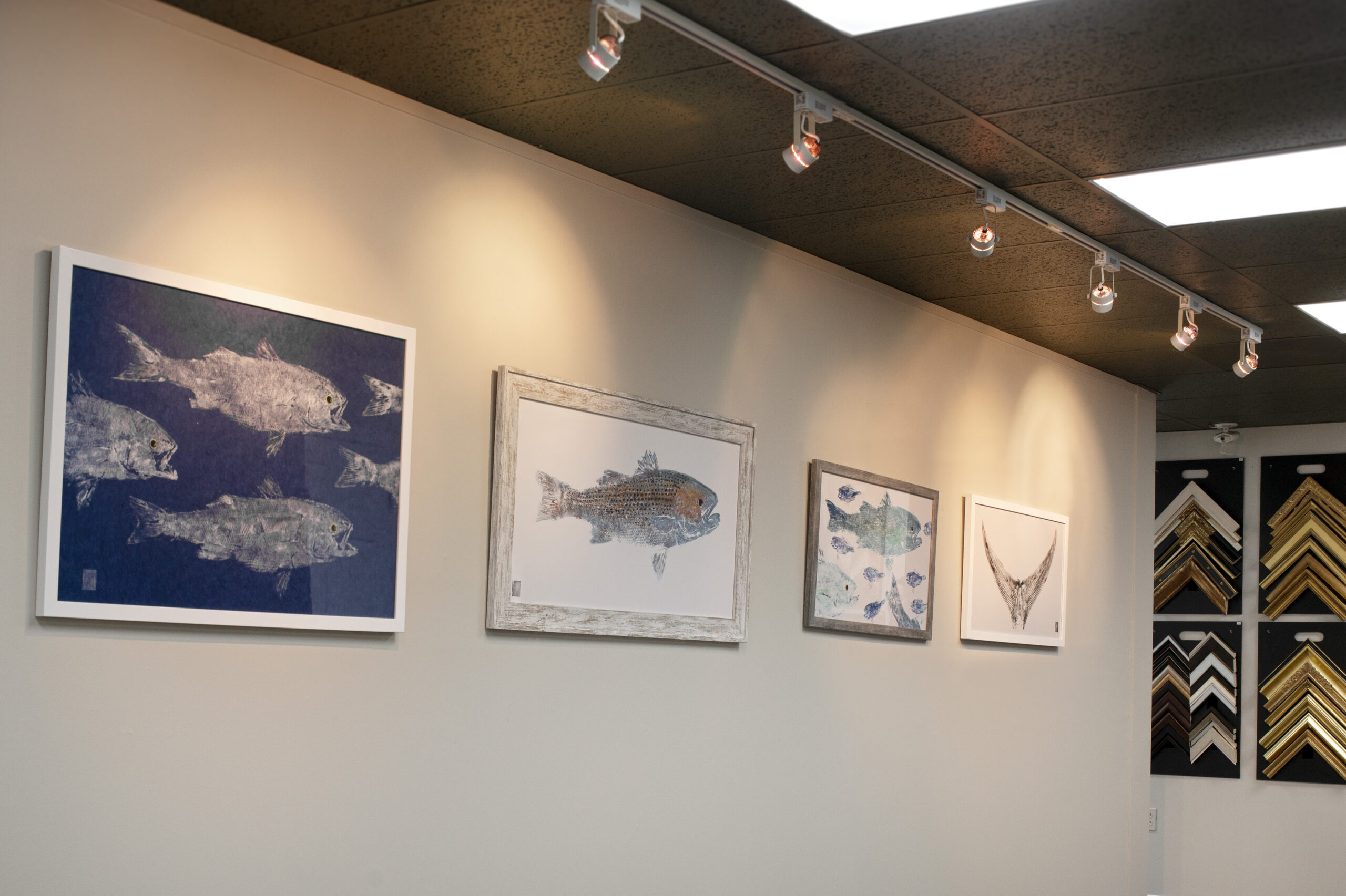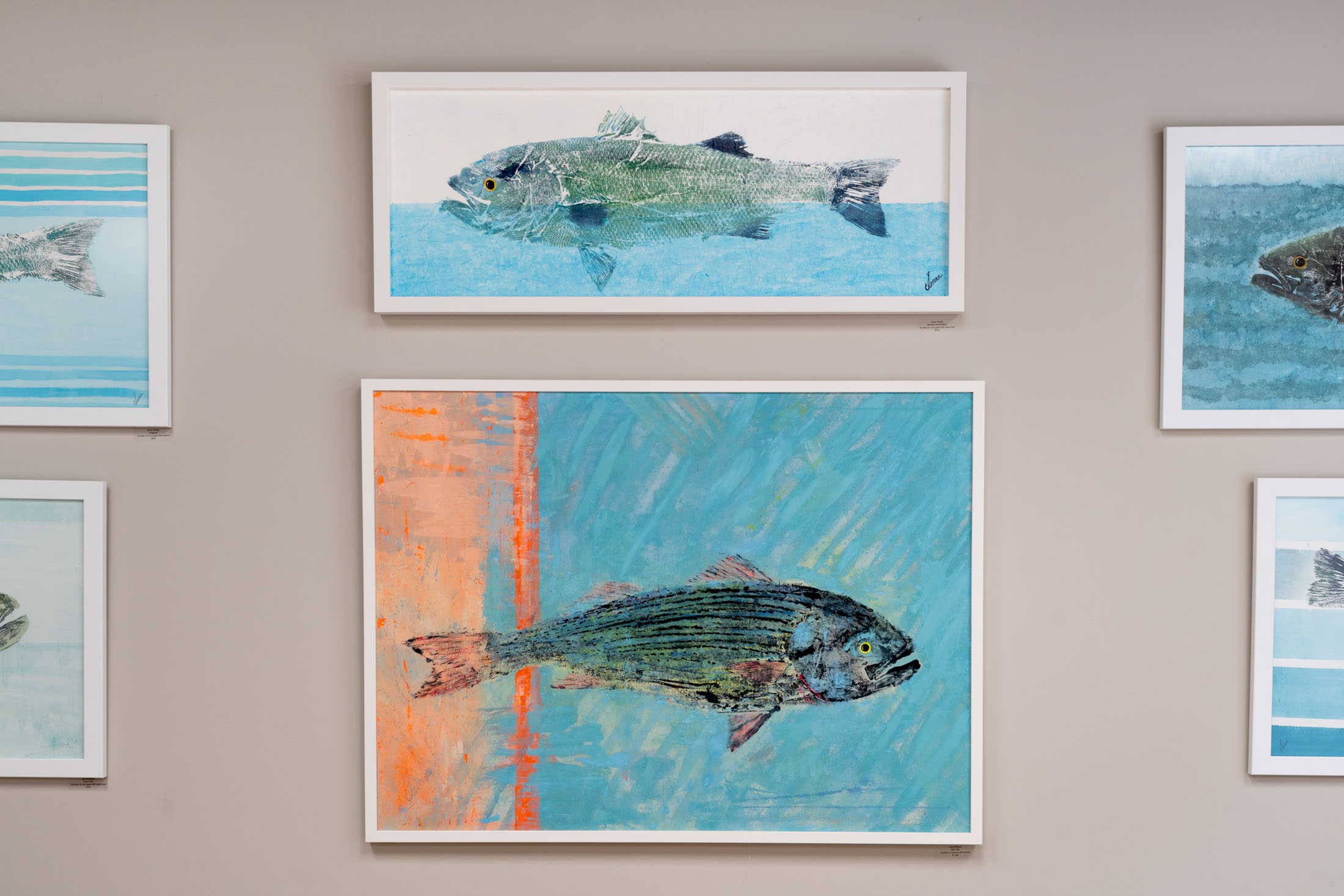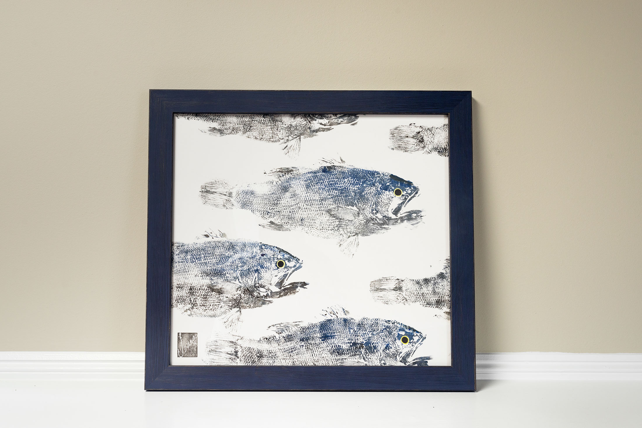 Jenna was born and raised in the fishing town of Scituate. As far back as she remembers she fished, painted and drew fish. She has used a vast palate of things found in nature or borrowed from her environment to create in all forms. “Gyotaku” is Japanese for fish rubbing, which was used by fisherman to record their catch. This old art form connects her passion for fishing, art and home decor. Every fish caught comes with a fish story. In each unique print, I am hopeful to recreate these stories. The process for each fish is forever changing. Every series is an experiment with colors, paper, textiles, mediums and framing. Her style is the grey area between abstract and real. The technique starts with painting a real fish, She then rubs the cloth or paper over the fish to create a direct print. With each step, She always tries to stay true to the environment. When possible, fish are fileted and eaten, textiles are repurposed and discarded wood is recycled for framing. Her prints can be about remembering the experience of reeling in a big catch, the smell of salt water or just being connected to nature.