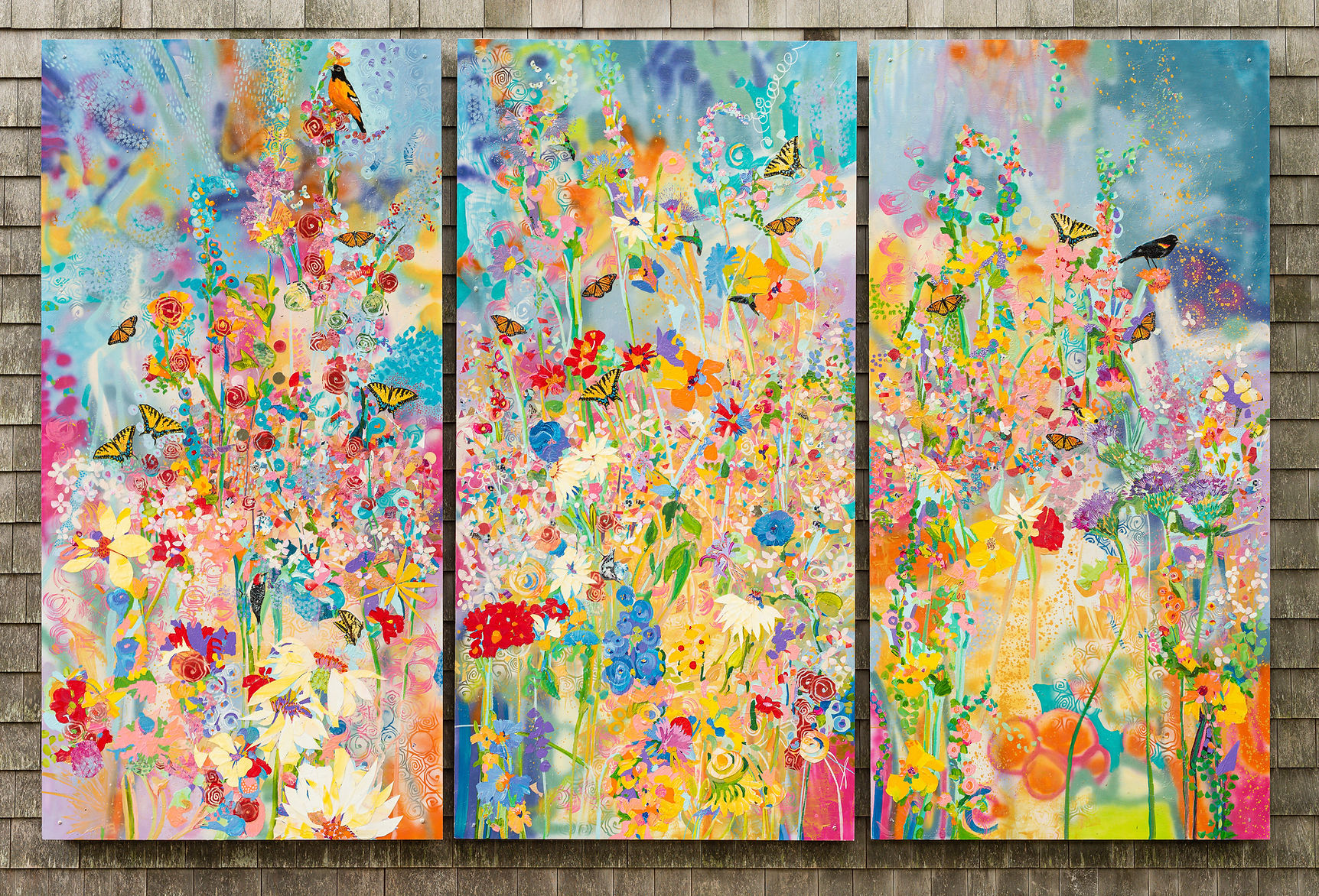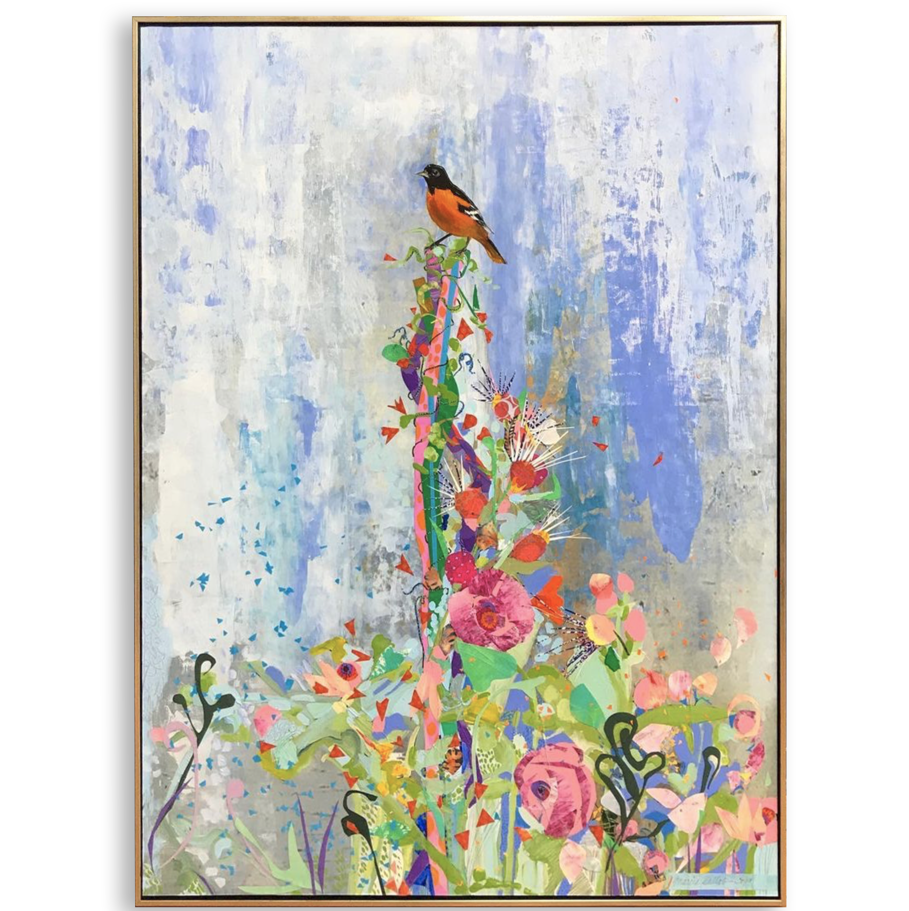Marcia’s compositions are enlivened by the unexpected combination of materials. The patterns create blossoms of textures on the surface of the painting. Her goal is to evoke joy.