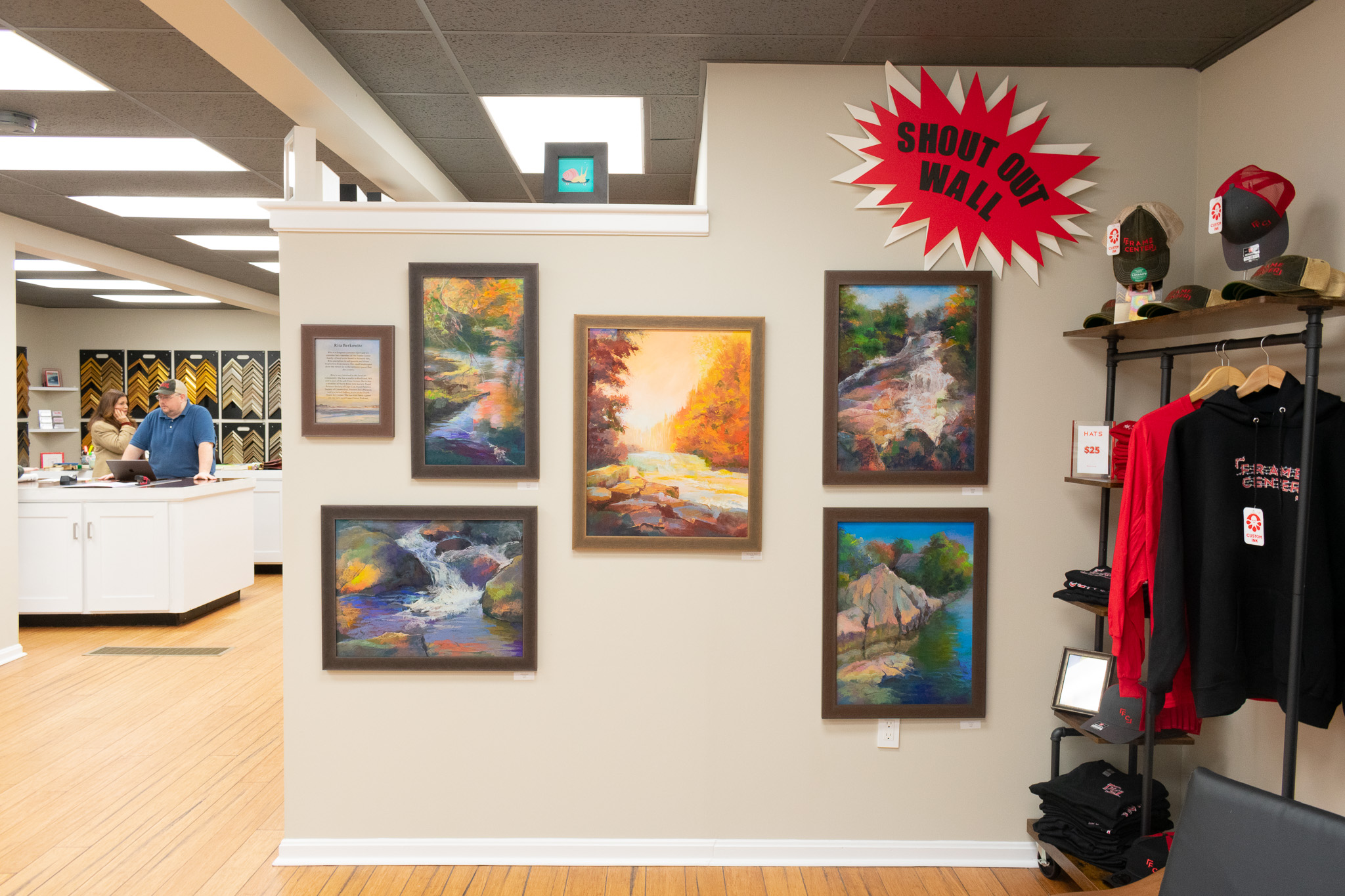 Rita Berkowitz has a Bachelors of Fine Art from Pratt Institute, and also attended there MFA in Boston, as well as a Masters of science in Psychological Counseling. She’s a member of the North River Art Society, and has been coming to Frame Center for a long time. For January/February 2023, she was featured on our “Shout Out Wall” in the front of the store.