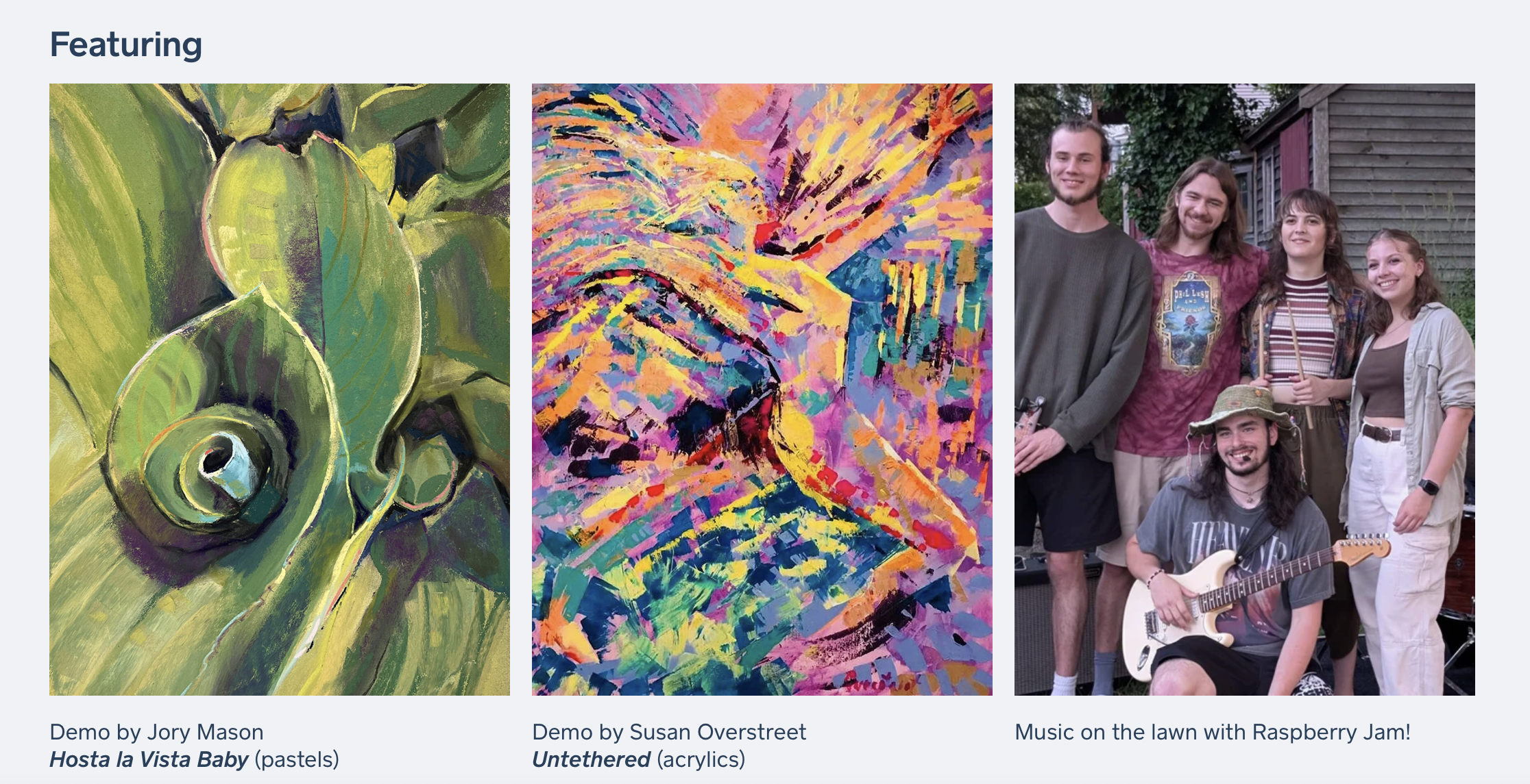 Demos by Artists Susan Overstreet and Jory Mason, and the popular band Raspberry Jam performing on the front yard. Learn about the many educational opportunities we offer! The Artisan Shop will be open, complimentary light refreshments, and wine for purchase.