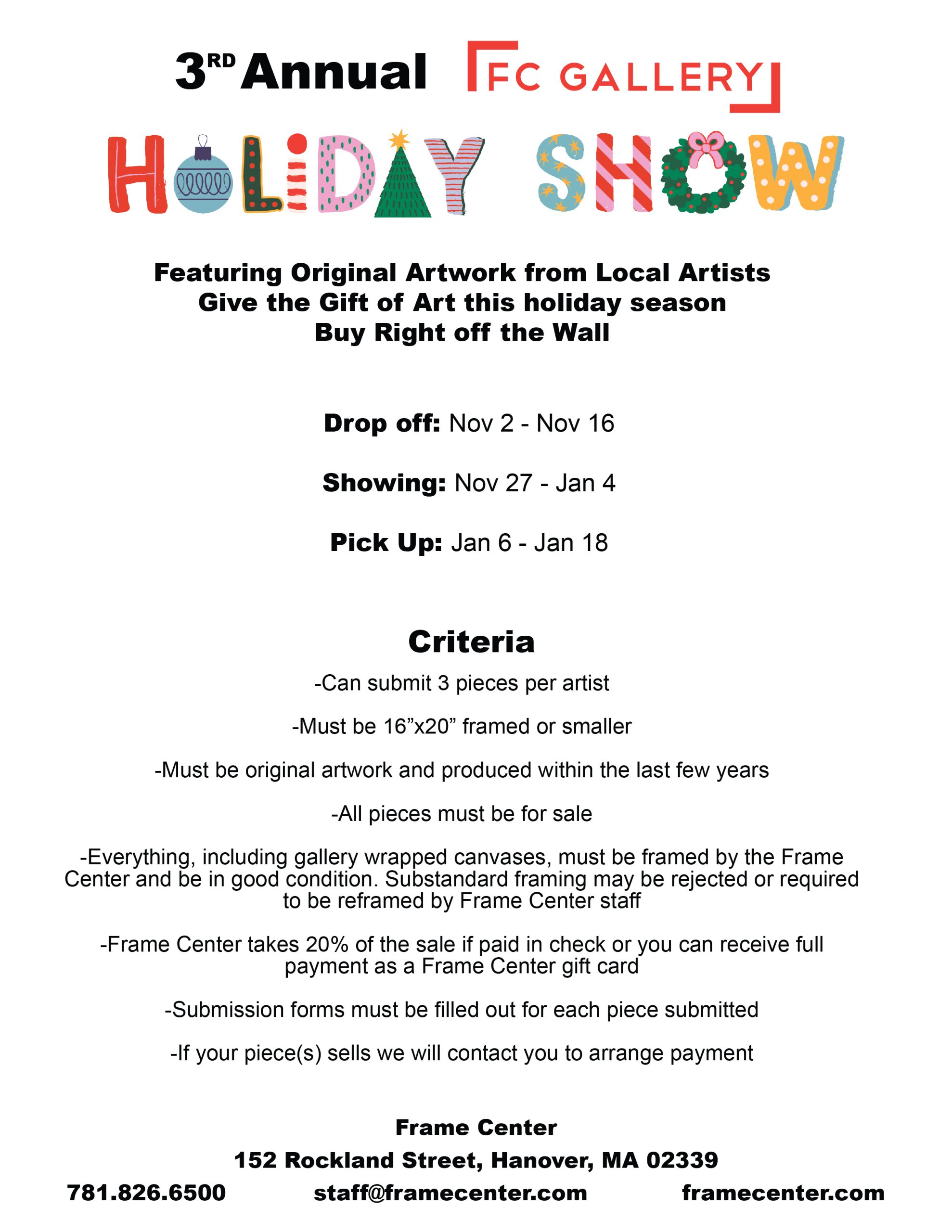 If interested, you can request a Submission Form via email from us at Staff@framecenter.com or stop in and see us in person.  You can also ask to be placed on our Email list for future shows and events.