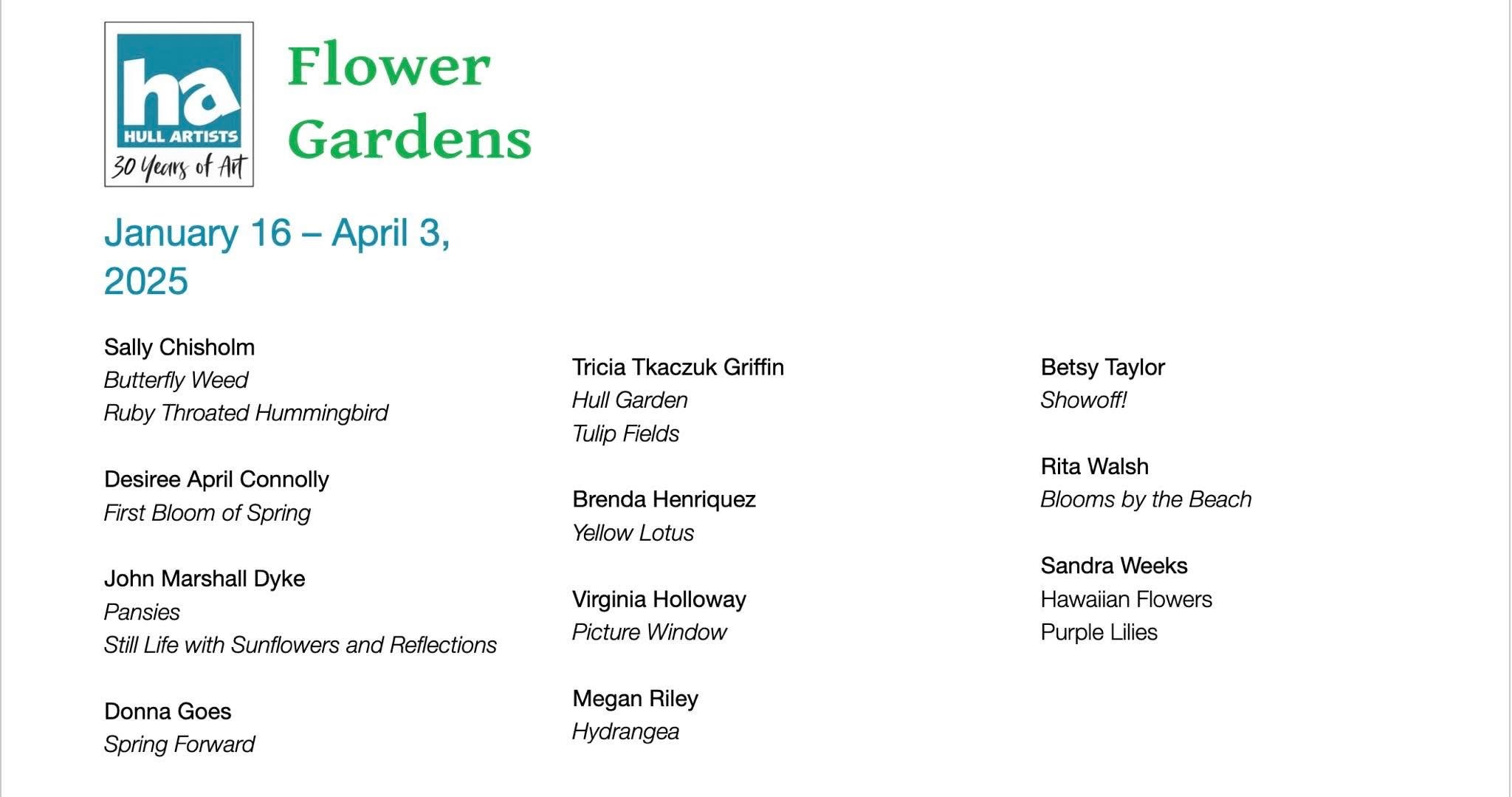 The Hull Artists have a new show hanging on the second floor of the Hull Public Library called “Flower Gardens”. The show will be up from January 17th until April 3rd.