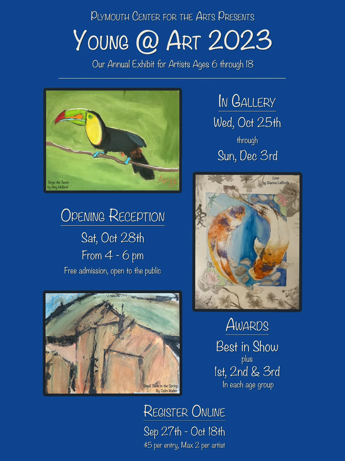 Plymouth Center for the Arts invites artists, ages 6 – 18, to submit their original artwork, in any medium, into our annual youth art competition and exhibit. This year’s exhibit will hang in the gallery for 5 weeks, which will provide more opportunity for family and friends to visit our gallery and enjoy the exhibit.