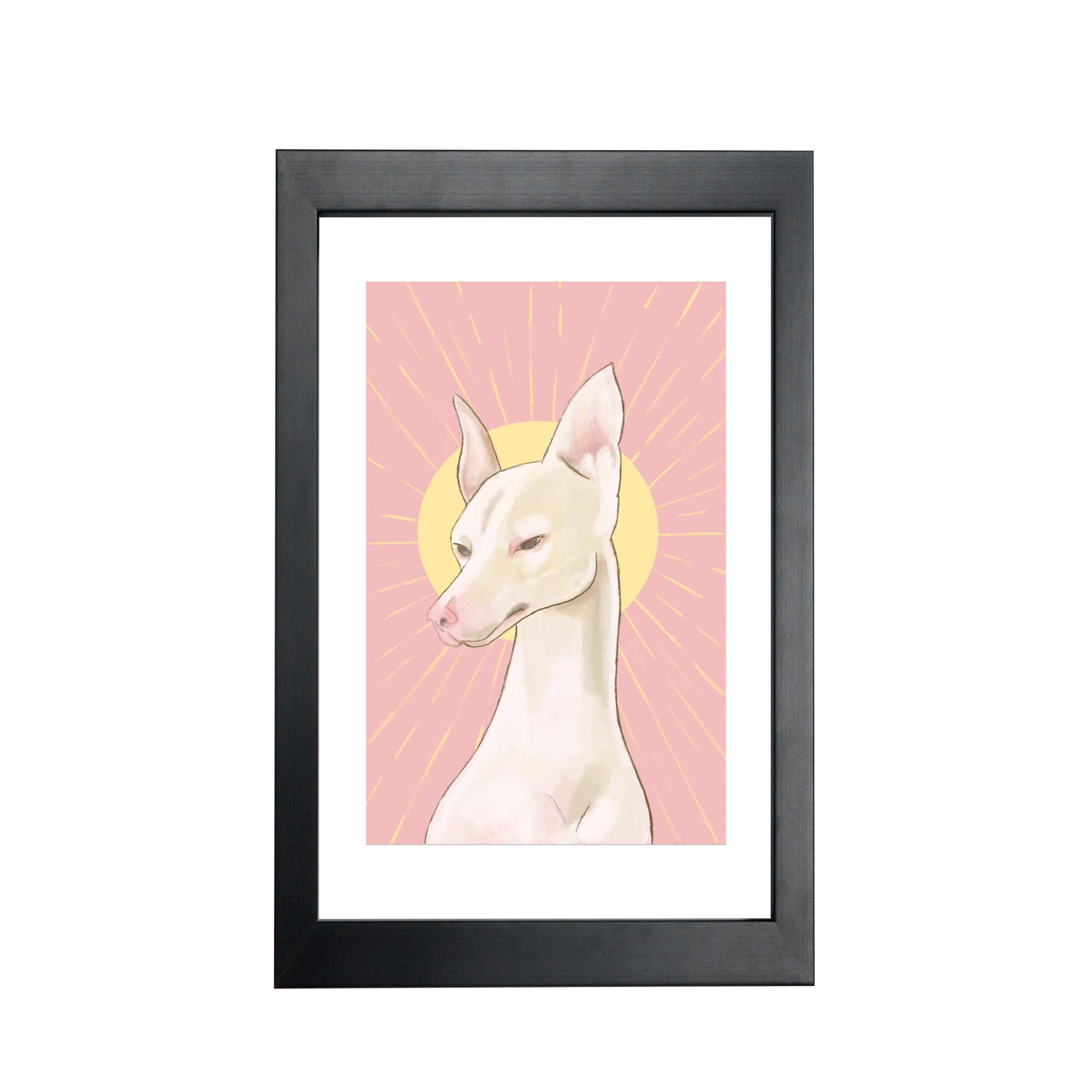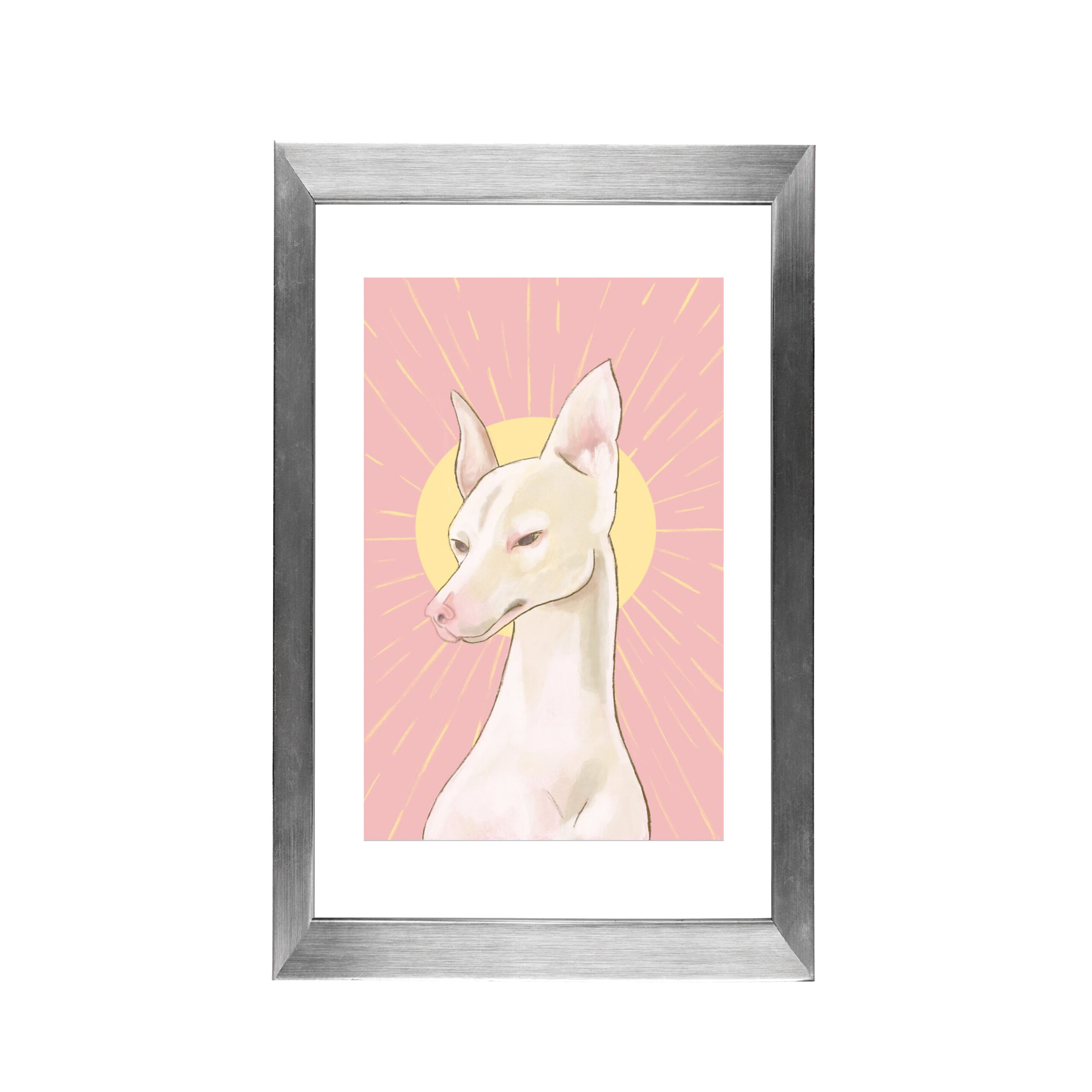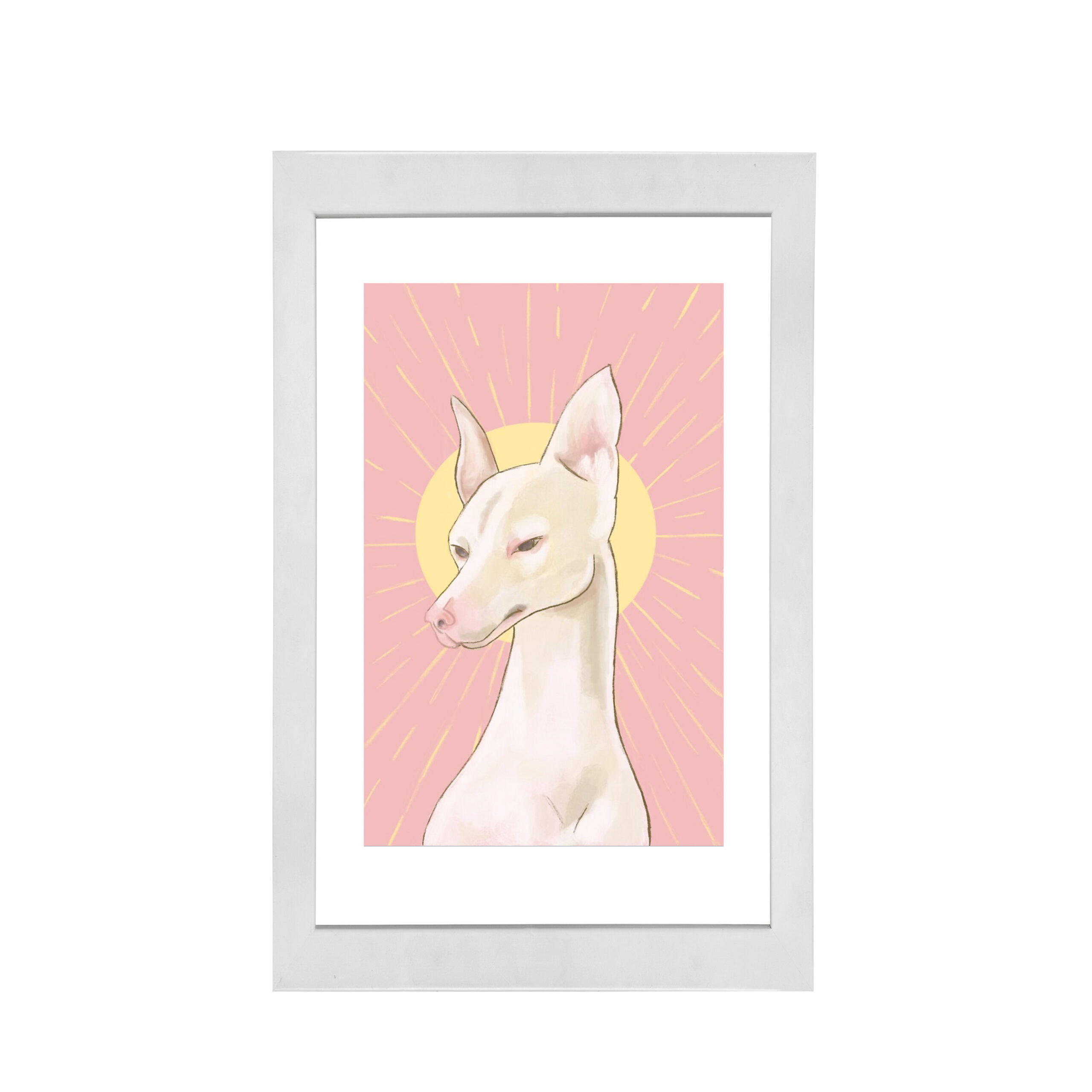 The rosy hues present on the stoic hound parallel the pink background while the bold yellow sun is placed upon its head like a crown. The sun’s rays spread across the entire picture plane, bringing a dynamic sense of movement to all four corners. The endearing expression on the hound’s face is one relatable to all viewers as one of detached resonance.